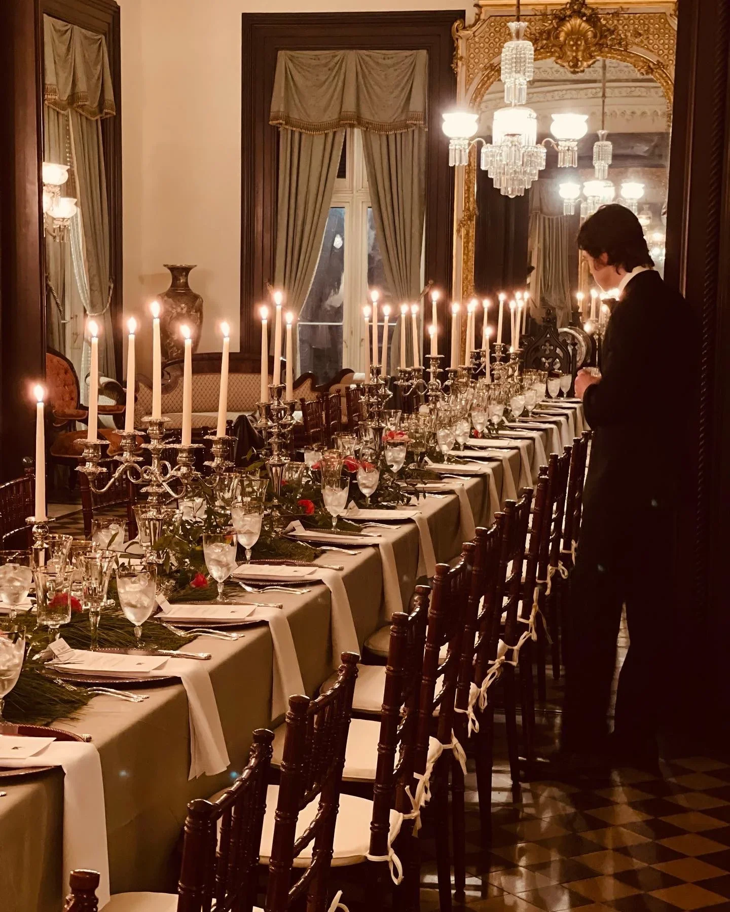 At the heart of the event, aside from the majesty of the venue, were our stunning tablescapes. Port Town Collective brought a sense of drama to the evening with tall, antique candelabras, while natural beauty was captured through foraged centerpieces of loblolly pine and floating camellias, artfully arranged in sterling compotes. Custom table linens in moss green velvet completed the vision perfectly coordinating with the home’s historic china pattern and pink place settings that added a nostalgic and timeless touch.