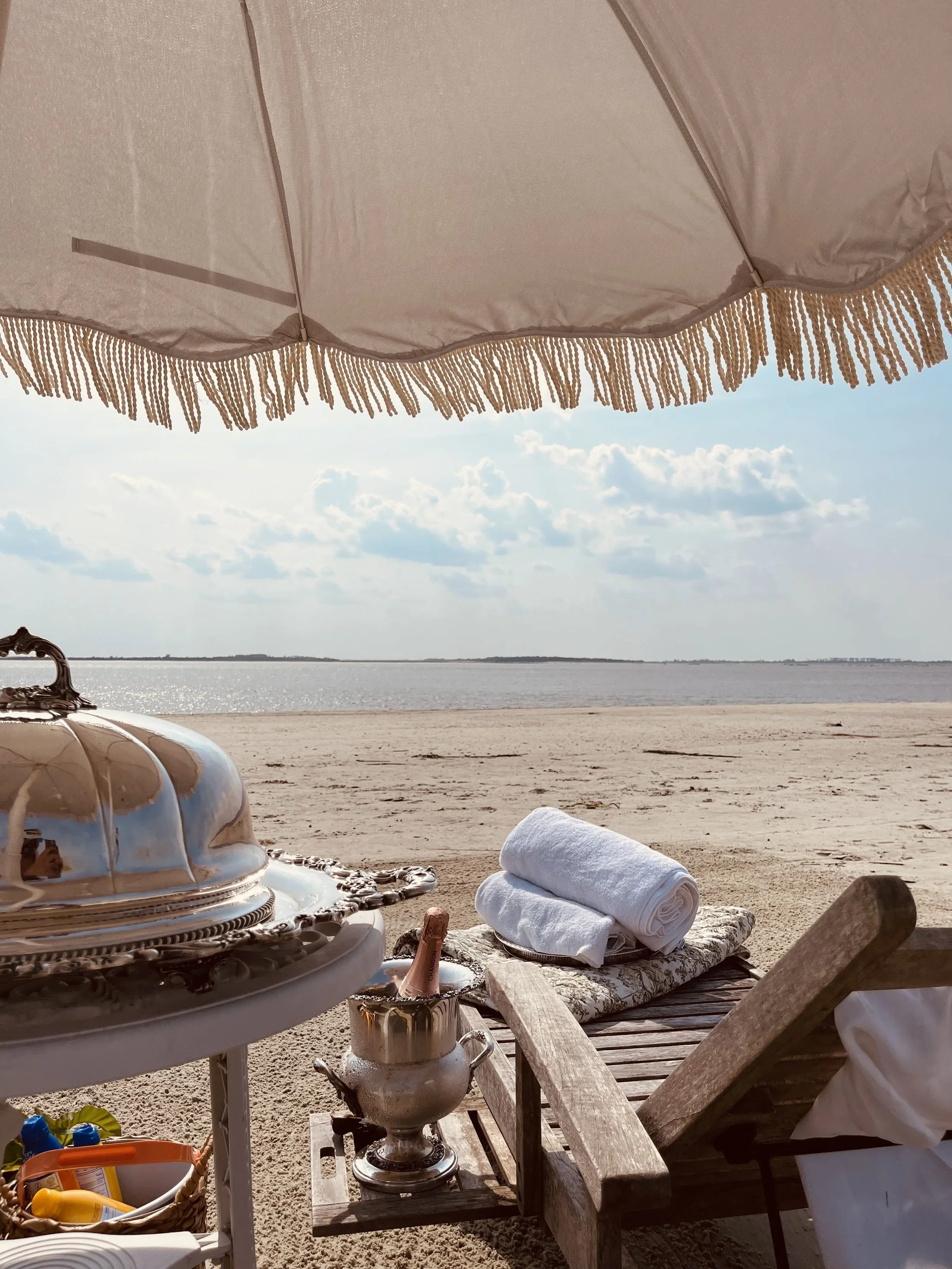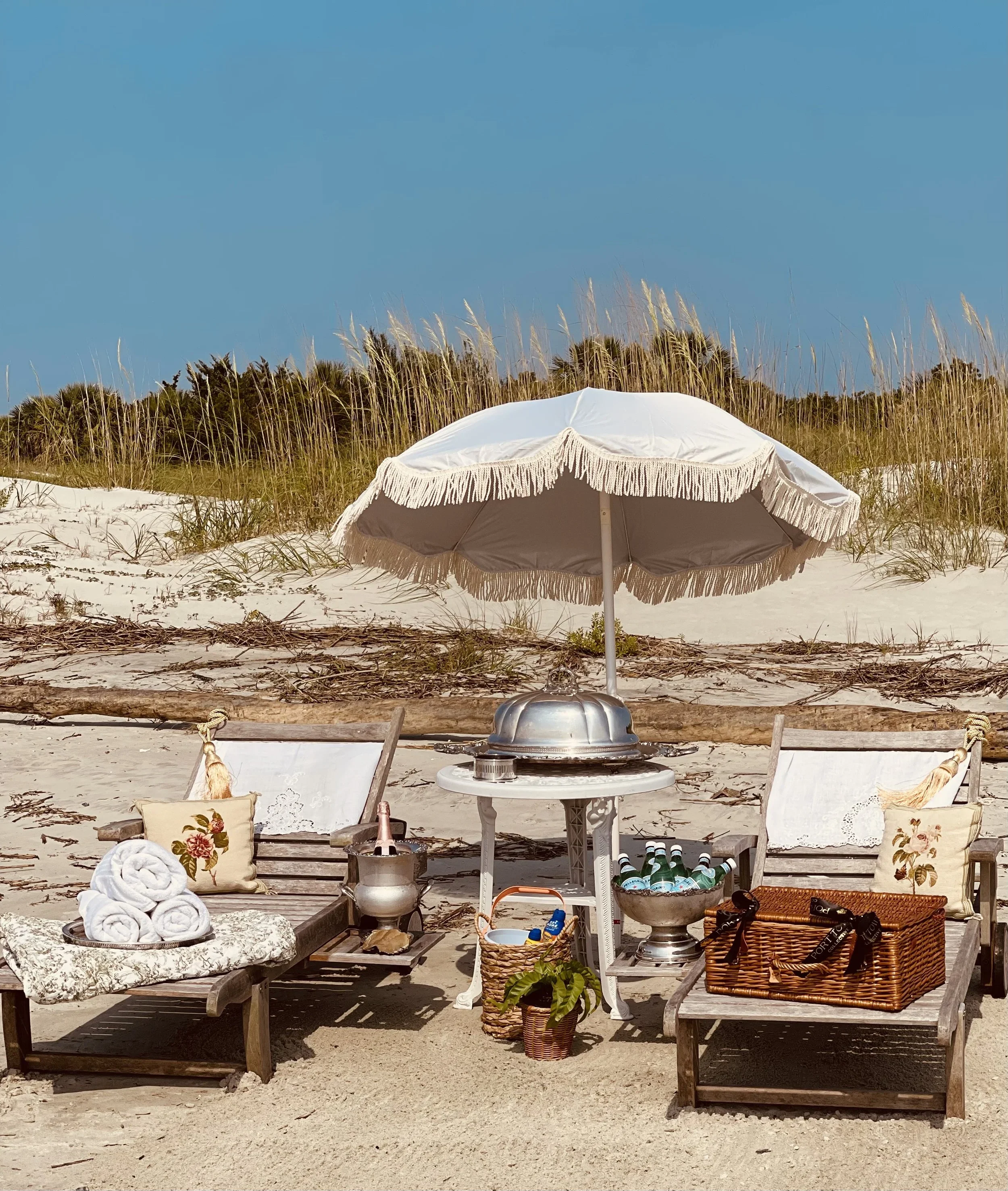 PTC was ready with their favorite Brut Rosé, and adorned the secluded spot with a fringed umbrella shade, comfy teak lounge chairs, plush towels, toile blankets, & Pellegrino.