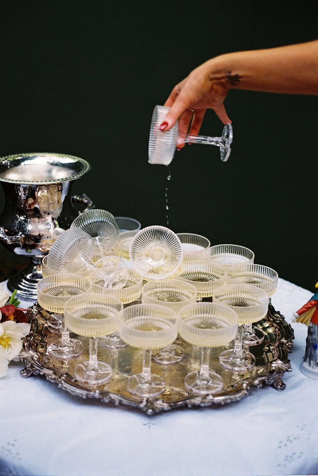 The setting was intentionally transportive: aged silver bowls overflowing with chilled champagne, vintage globes recalling journeys across Europe, rattan lamps casting pools of amber light across the counter. Even the smallest details, from the crystal coupes to the silver-plated trays, were chosen to invite guests closer, to make them linger.