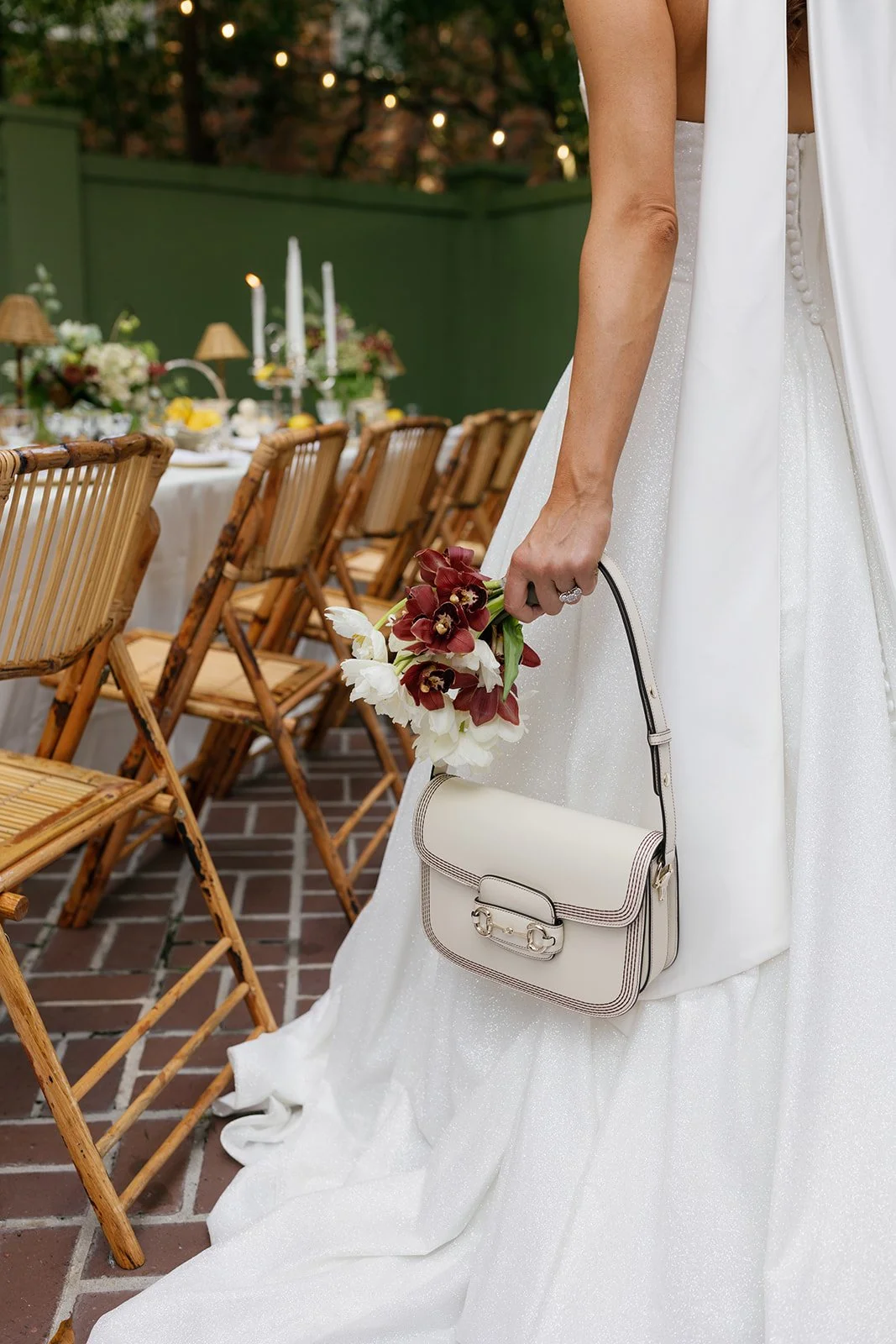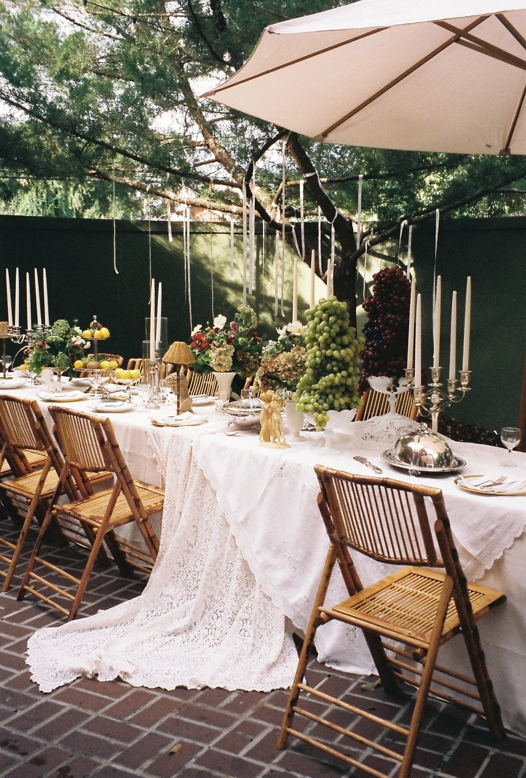 The tablescape is designed to feel abundant, but never excessive. Layers of ivory linen and gathered lace fall effortlessly over the edges. Woven bamboo chairs lend a touch of rustic charm, grounding the polished silver and crystal that dance in the flicker of candlelight.