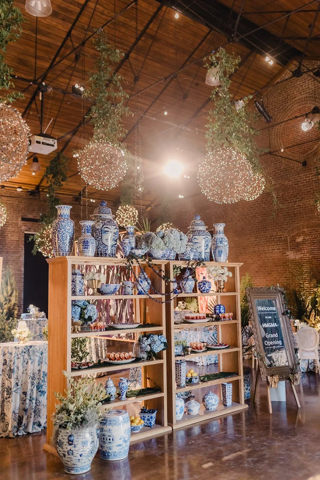 (Our reception look board helped us explore the idea of layering traditional Lowcountry influences with couture tablescapes, statement arches, and Savannah-inspired blue-and-white prints—elements that later shaped how the food and setting conversed with one another.)